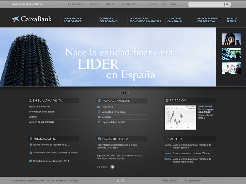 Amb motiu del naixement de CaixaBank, es va encarregar a McCann Barcelona la proposta de disseny web i l’organització de continguts per a la part privada dels inversors. El principal repte era presentar una gran quantitat d’informació en un espai reduït, tant a la pàgina d’inici com als menús.